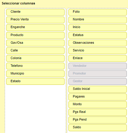 - Las primeras columnas contienen los campos de: Folio, Nombre, Inicio, Estatus, Observaciones, Servicio, Enlace, Vendedor.