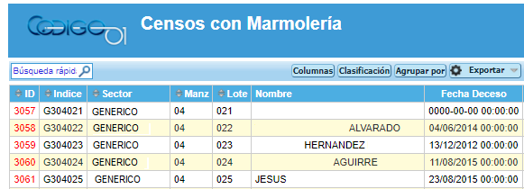 - Se puede realizar agrupamiento por: Indice, Sector, Tipo de Sepultura, Monumento, Jardinera, Lápida, Cruz de Madera, Cruz de Hierro, etc.
